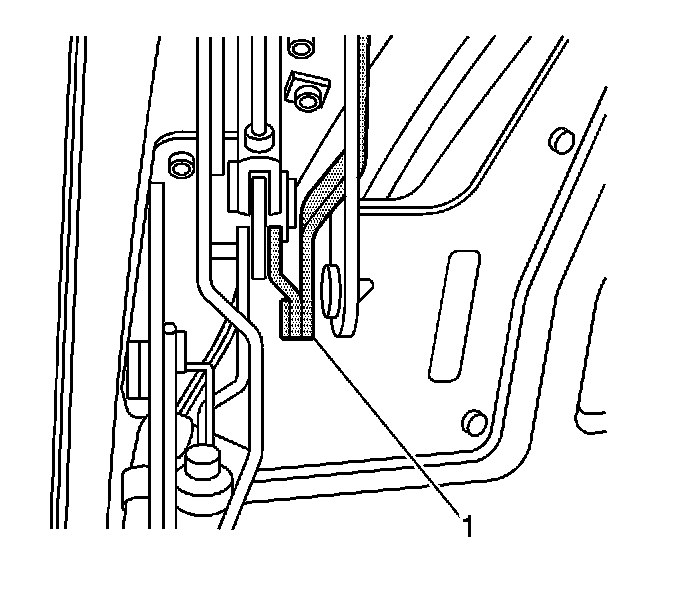 27. Remove the fastener (1) from the retaining bracket that holds the rear mounted door release cable (2).