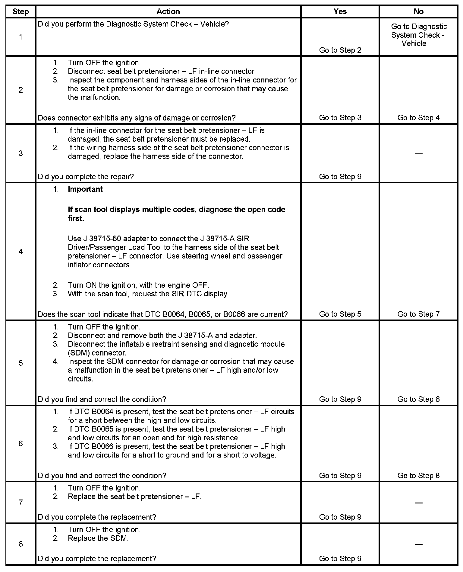 6. Tests to see what DTCs are present. If DTC B0064 is present, test the seat belt pretensioner - LF for a short between high and low circuits. If DTC B0065 is present, test the seat belt pretensioner - LF high and low circuits for an open and for high resistance. If DTC B0066 is present, test the seat belt pretensioner - LF high and low circuits for a short to ground and for a short to voltage.