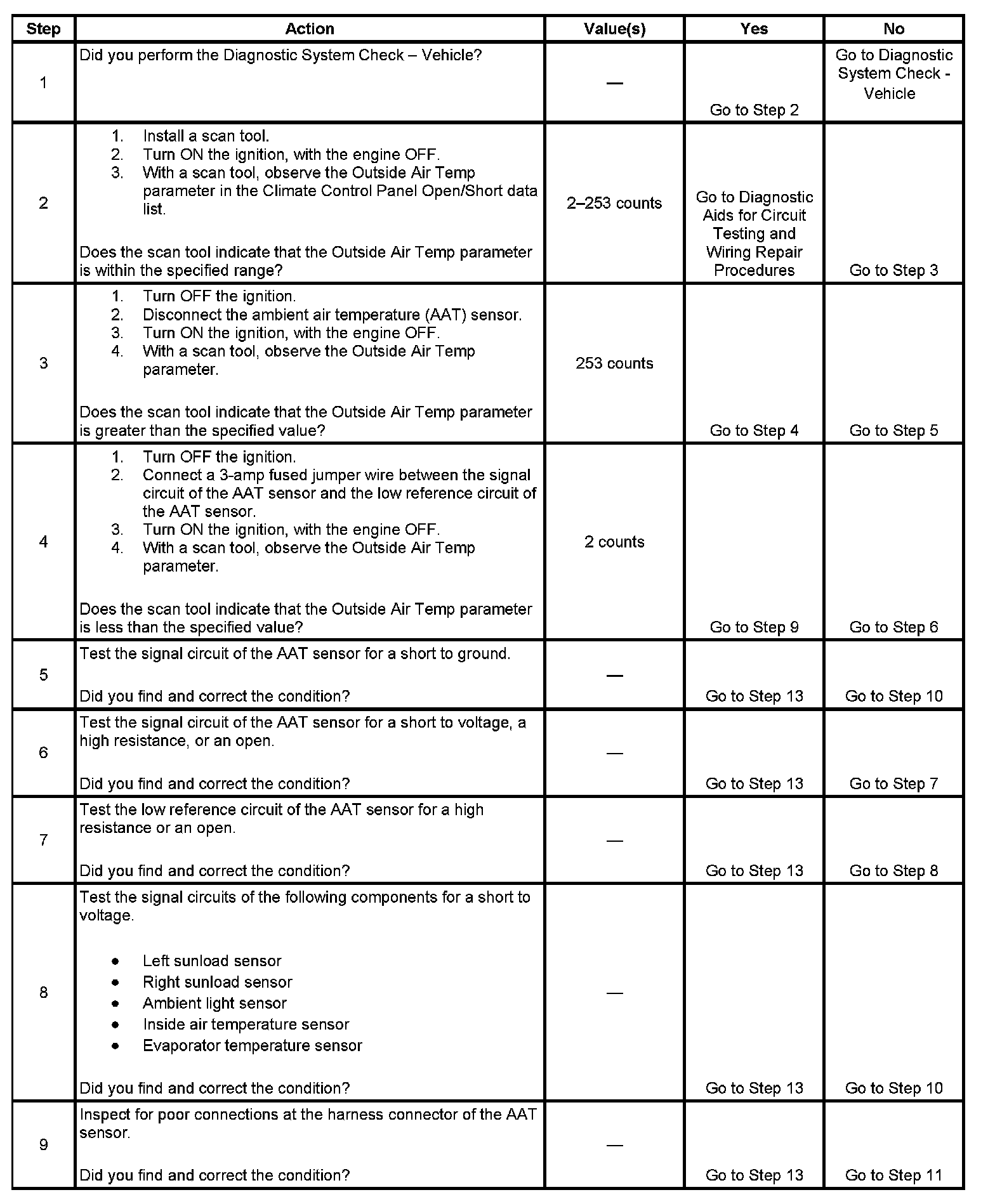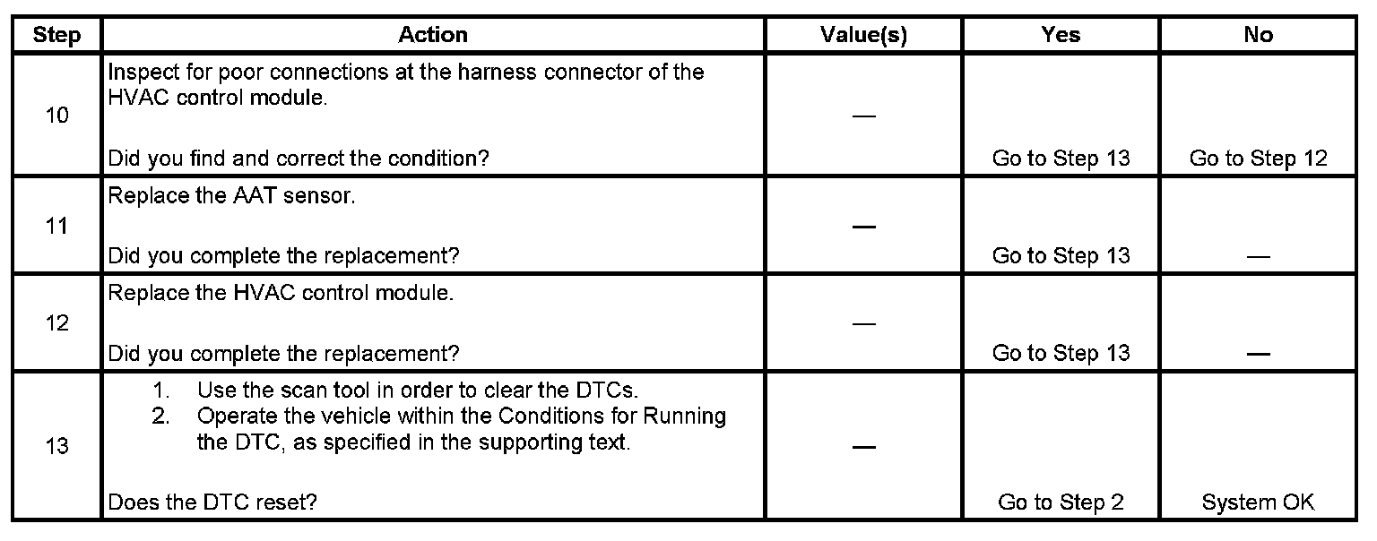 The HVAC control module detects the AAT sensor signal circuit is more than 253 counts for more than 30 seconds.