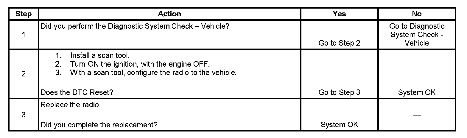 Re-calibration with the correct calibrations for the vehicle and cycling the radio to OFF then to ON will clear the DTC if there is no damage to the radio.