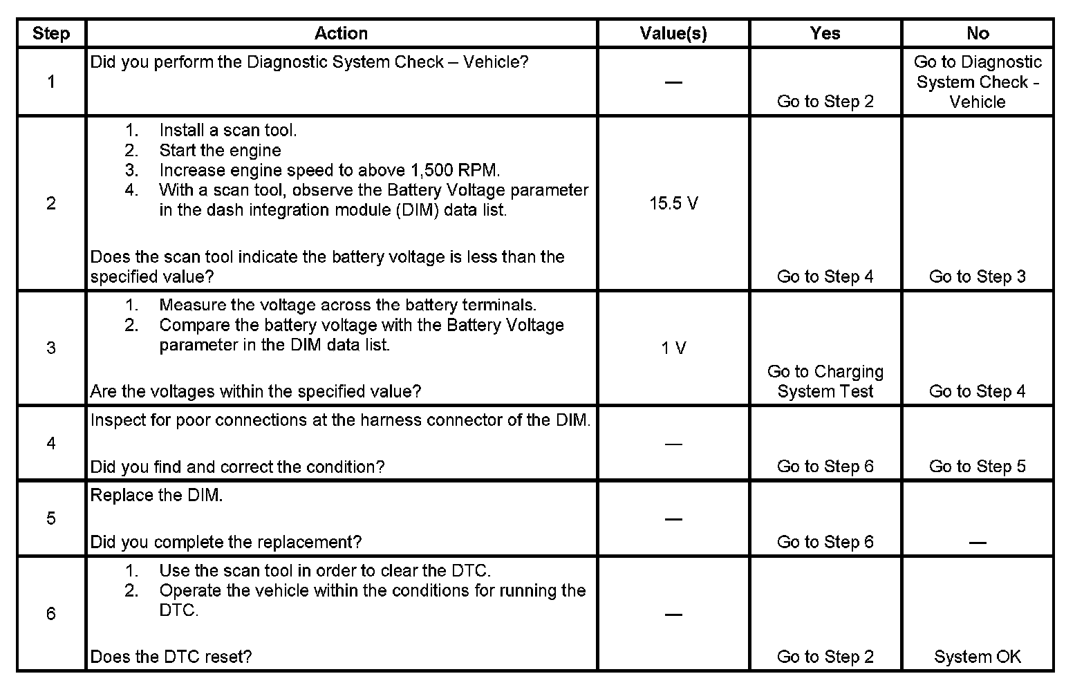 The dash integration module (DIM) has an internal voltage sensor with a dedicated circuit that checks the battery positive voltage and battery negative circuit voltage to determine if it is below 15.5 volts.