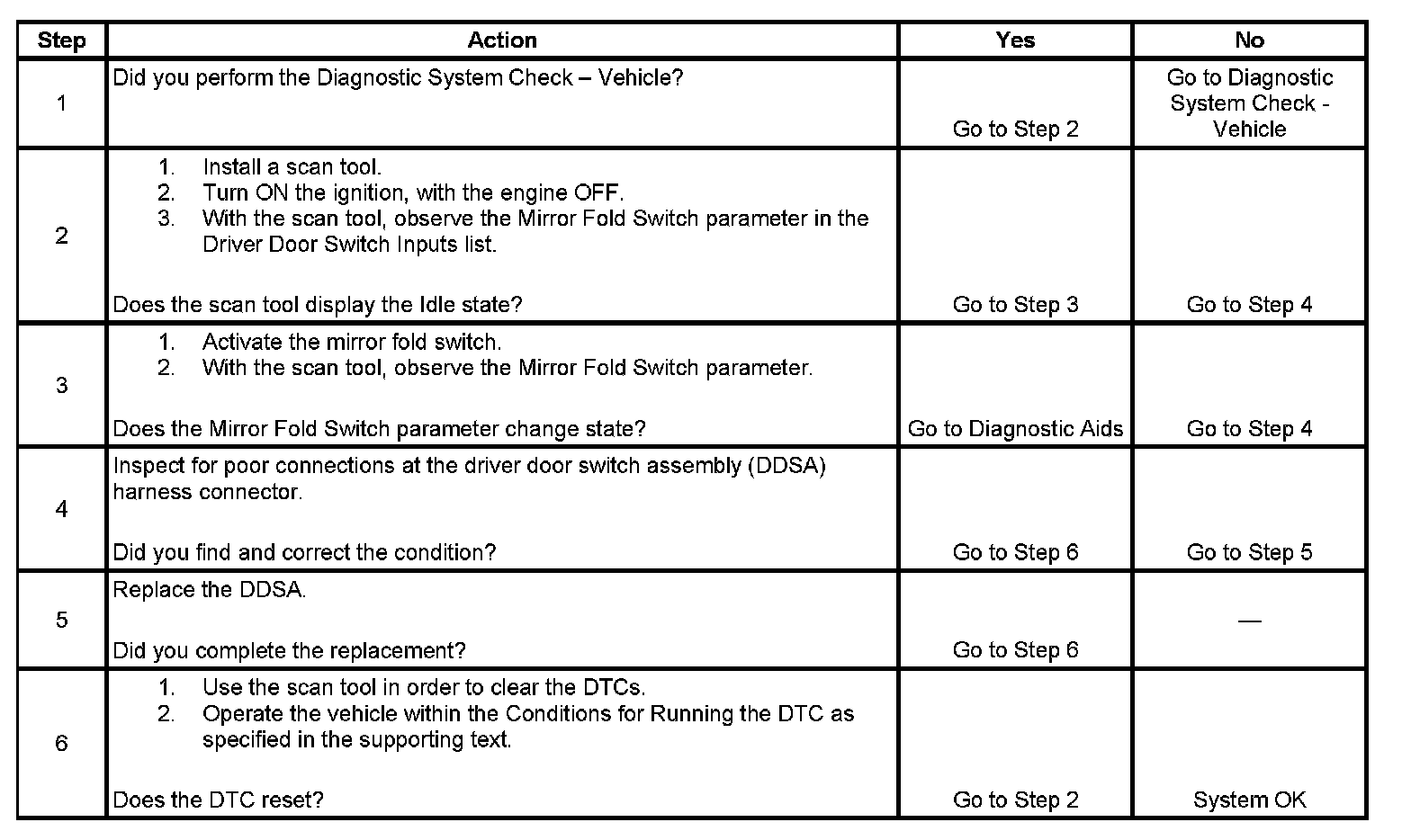 The switch that failed and generated this DTC is a built-in part of the driver door switch assembly (DDSA). This assembly contains a microprocessor which takes the signal generated by the switch and assigns a digital message to the switch signal. The DDSA then sends this message over the serial data class 2 line to the driver door module (DDM) and the passenger front door module (PFDM) to move the mirrors. The DDM and the PFDM then apply voltage and ground to the appropriate circuit of their respective mirror fold motor to fold/retract or unfold/extend the mirrors. The mirror fold motors are reversible.