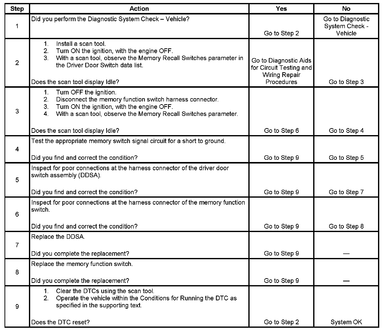 If a memory switch signal circuit is active for more that 30 continuous seconds, the circuit will be considered shorted, and the DDSA will set this DTC.