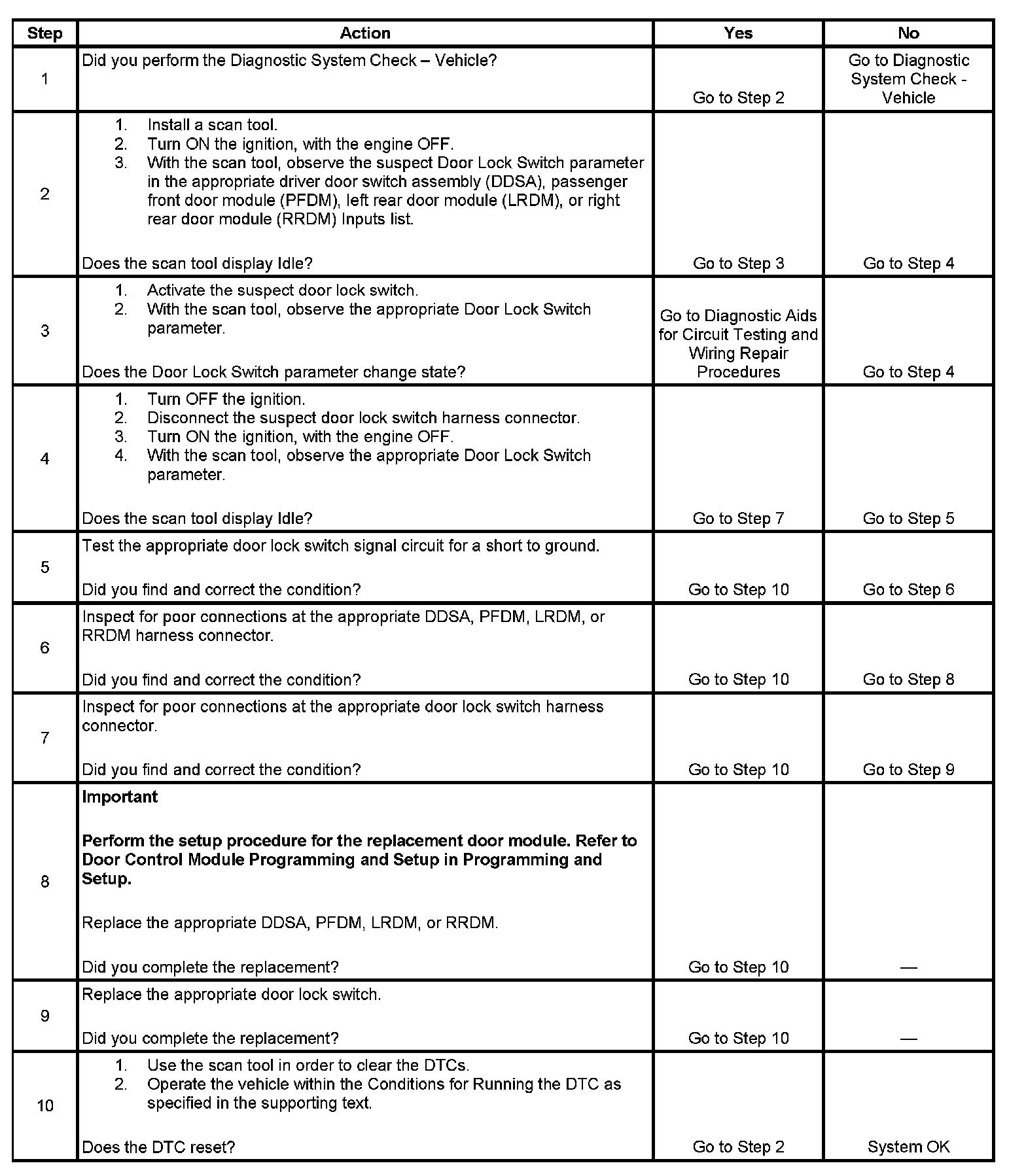 The switch that failed and generated the DTC is wired to either the driver door switch assembly (DDSA), passenger front door module (PFDM), left rear door module (LRDM), or right rear door module (RRDM). When a door lock switch is activated to the lock or unlock function, the DDSA, PFDM, LRDM, or RRDM receives the switch input and sends the information on, via the serial data class 2 communications line, to the rear integration module (RIM), which is the master of all lock operations. If the RIM determines that the message is a valid request and conditions are correct for a door lock function to occur, it sends its OK back to all the door modules to lock or unlock the doors. Each door module supplies power and ground to its associated lock actuator to lock or unlock the associated door.