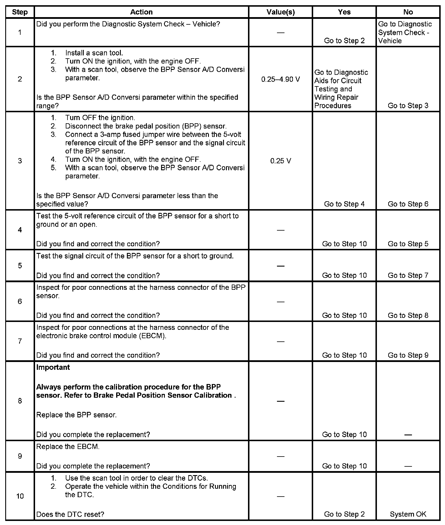 The brake pedal position (BPP) sensor is a potentiometer. The electronic brake control module (EBCM) supplies a 5-volt reference circuit and low reference circuit to the BPP sensor. The BPP sensor signal circuit is a direct input to the EBCM. The EBCM determines the BPP based on the voltage from the BPP sensor. The EBCM converts the BPP sensor feed back voltage to a digital signal and puts it on the class 2 communication bus. If the voltage is less than 0.25 volts, then DTC C0283 will set.