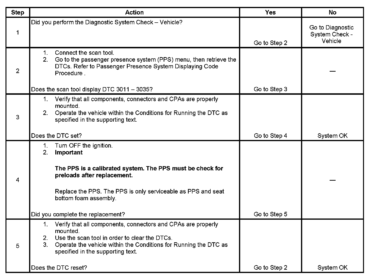 The inflatable restraint passenger presence system (PPS) is used to monitor the pressure profile of any occupant that is sitting in the front outboard passenger seat and communicate the profile classification to the sensing and diagnostic module (SDM). The SDM will either enable or suppress the deployment of the instrument panel (I/P) module based on the profile classification of the occupant. If the PPS detects this DTC within the PPS, then the PPS will communicate to the SDM through a non class 2 communications circuit that a PPS fault is present. The SDM will then set DTC B0092 indicating a problem within the PPS.