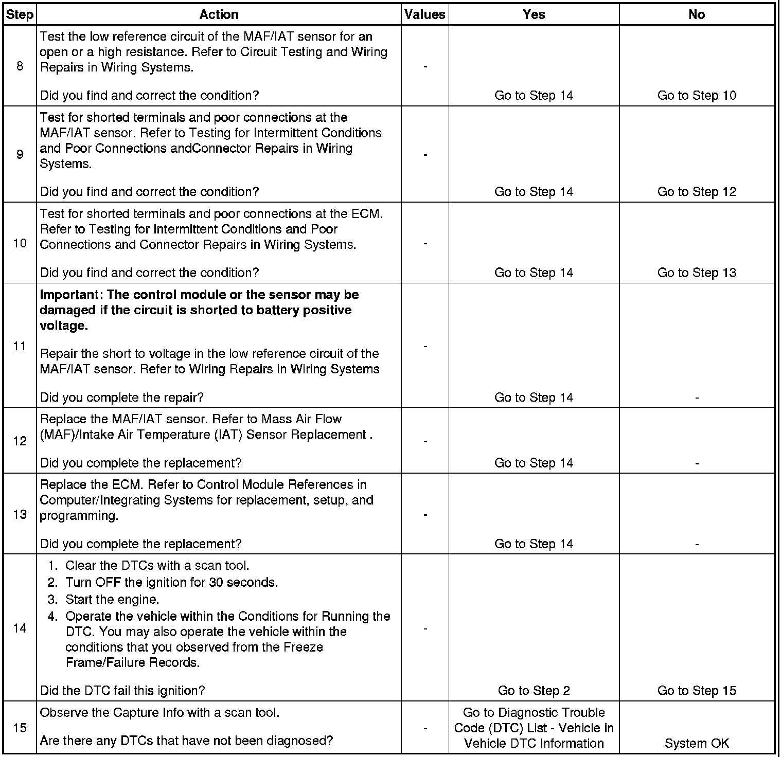 5. This step tests for high resistance in the low reference circuit of the MAF/IAT sensor. The MAF sensor and the IAT sensor share the low reference circuit. If there is a condition with the low reference circuit, a MAF and IAT sensor DTC may set. The ECM must be completely powered down to obtain an accurate resistance reading. It may take up to 30 minutes for the ECM to power down after the ignition key is removed. Removal of the ECM/TCM fuse allows the ECM to power down completely.