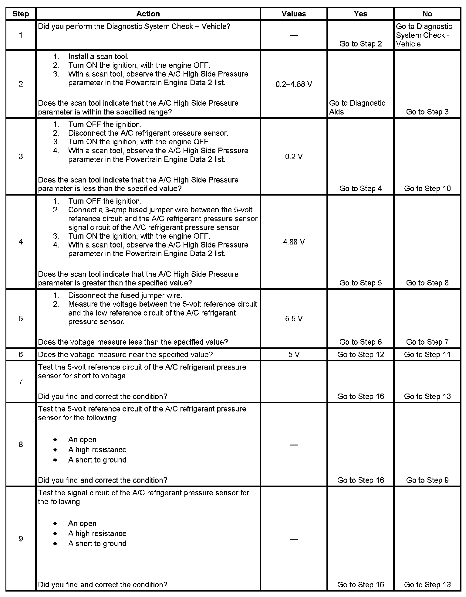 The engine control module (ECM) monitors the high side refrigerant pressure via the A/C refrigerant pressure sensor. The ECM applies a 5-volt reference and a low reference to the sensor. Changes in the A/C refrigerant pressure cause the A/C refrigerant pressure sensor signal to the ECM to vary. When the pressure is high the signal voltage is high. When the pressure is low the signal voltage is low. When pressure is high the ECM commands the cooling fans on. When pressure is too high or too low the ECM will not allow the A/C compressor clutch to engage. When the DTC is set, the ECM does not allow the A/C compressor clutch to engage. This is done to protect the compressor.