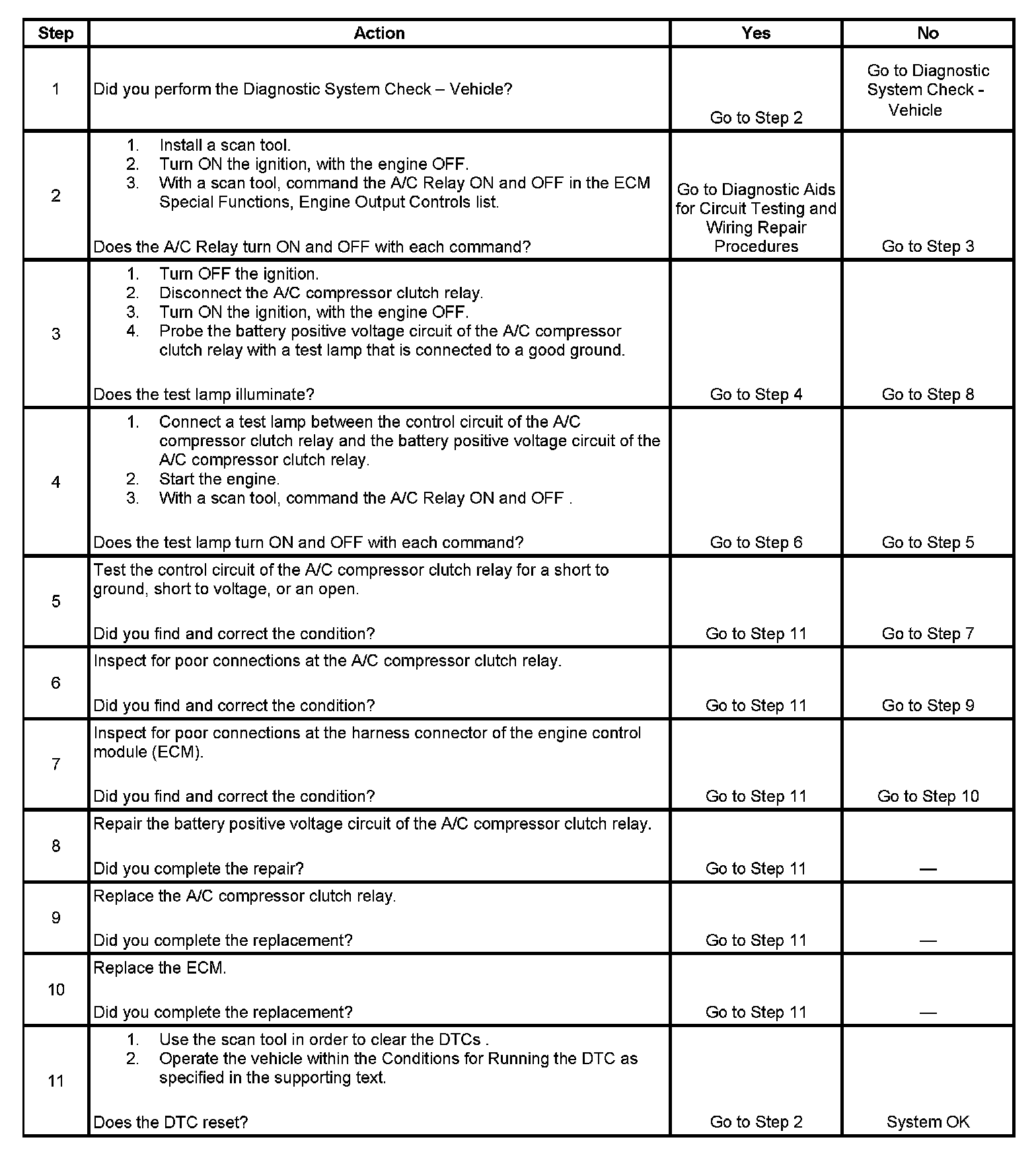 Ignition voltage is supplied directly to the A/C compressor clutch relay. The engine control module (ECM) controls the relay by grounding the A/C clutch relay control circuit via an internal solid state device called a driver. The primary function of the driver is to supply the ground for the component being controlled. The driver has a fault line which is monitored by the ECM. When the ECM is commanding a component ON, the voltage of the control circuit should be near 0 volts. When the ECM is commanding the control circuit to a component OFF, the voltage potential of the circuit should be near battery voltage. If the fault detection circuit senses a voltage other than what is expected, this DTC will set.