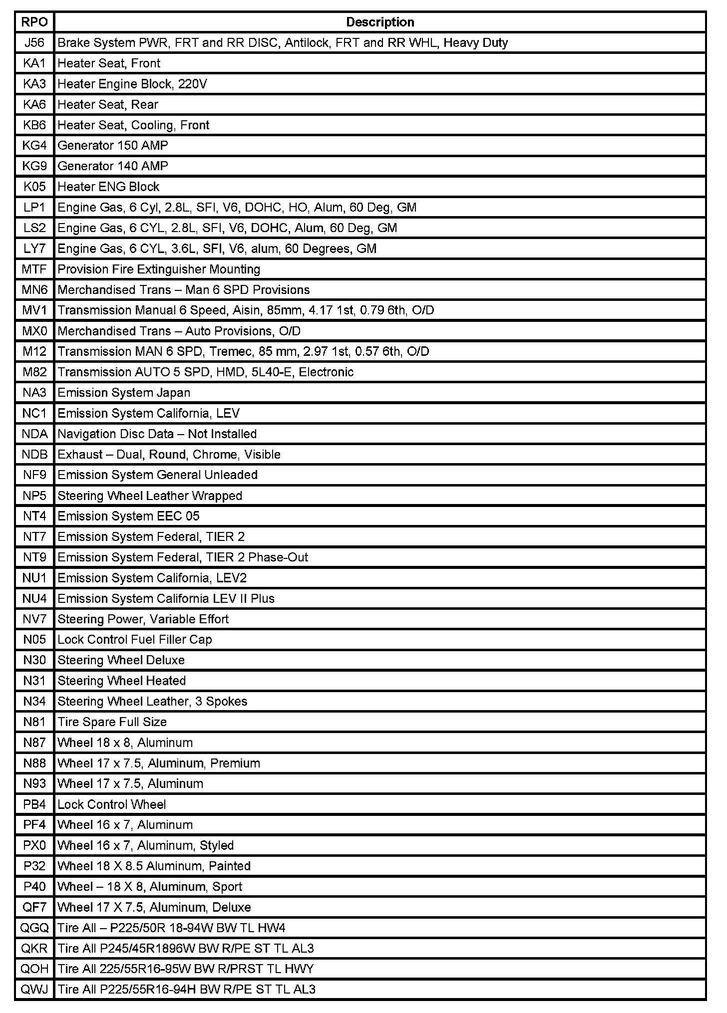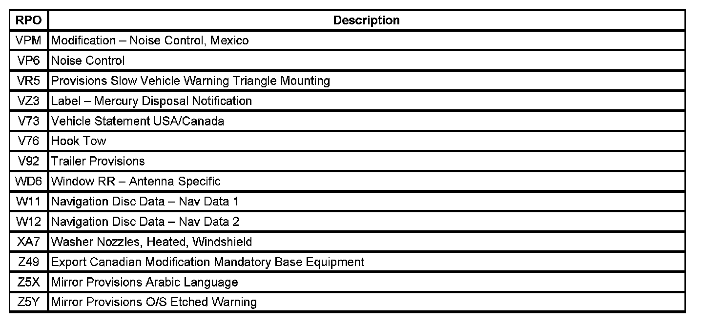 The table provides the description of the Regular Production Option (RPO) codes that are available on the vehicle. The vehicle's RPO list is printed on the Service Parts Identification Label.