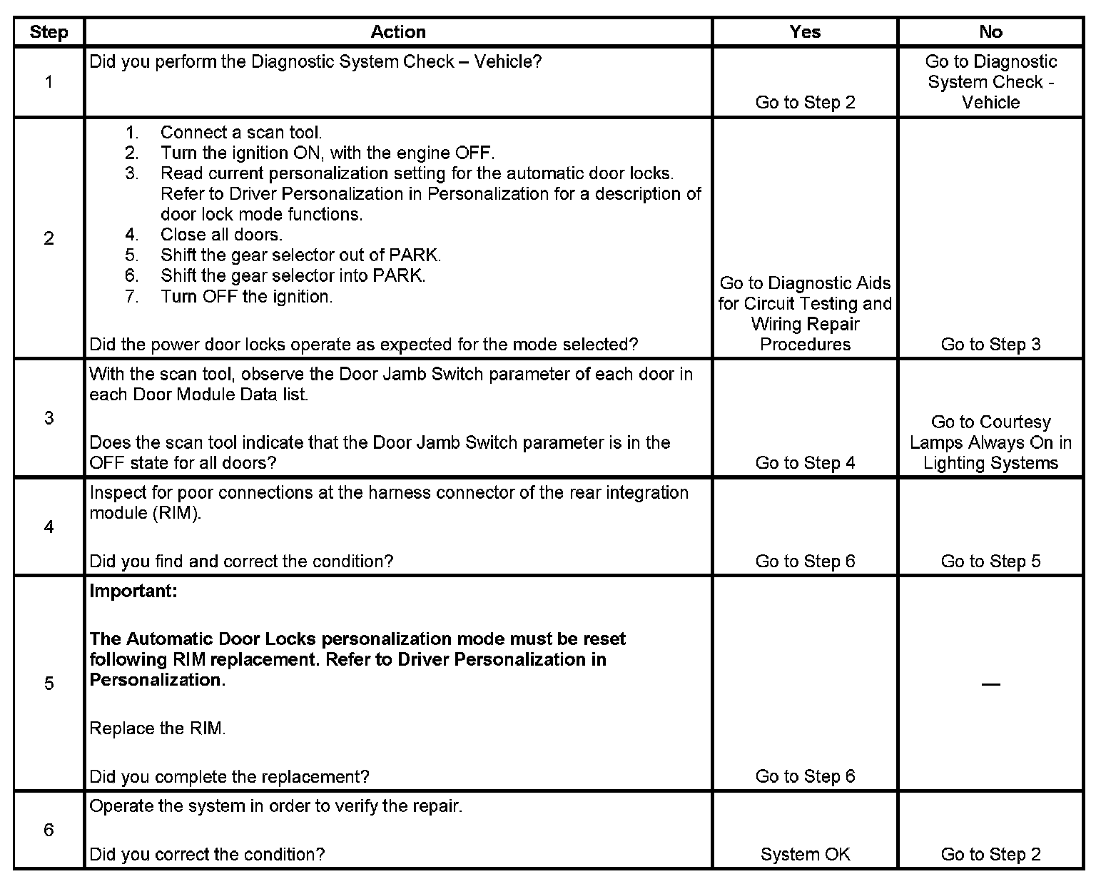 3. This step determines if the door jamb switch, also known as the door open switch, may be the cause of the malfunction. If the status of any door is interpreted as open, the rear integration module (RIM), which is the door lock master, will not permit the doors to automatically lock. If the scan tool display indicates that the door open/jamb switch is active when in fact the door is closed, it is likely that a failure has occurred to the door open/jamb switch or its circuits. Since the door open/jamb switch also controls courtesy lights, this failure is diagnosed in Lighting Systems.The door open/jamb switch must not be confused with the door ajar indicator switch, which has no affect on door locks.