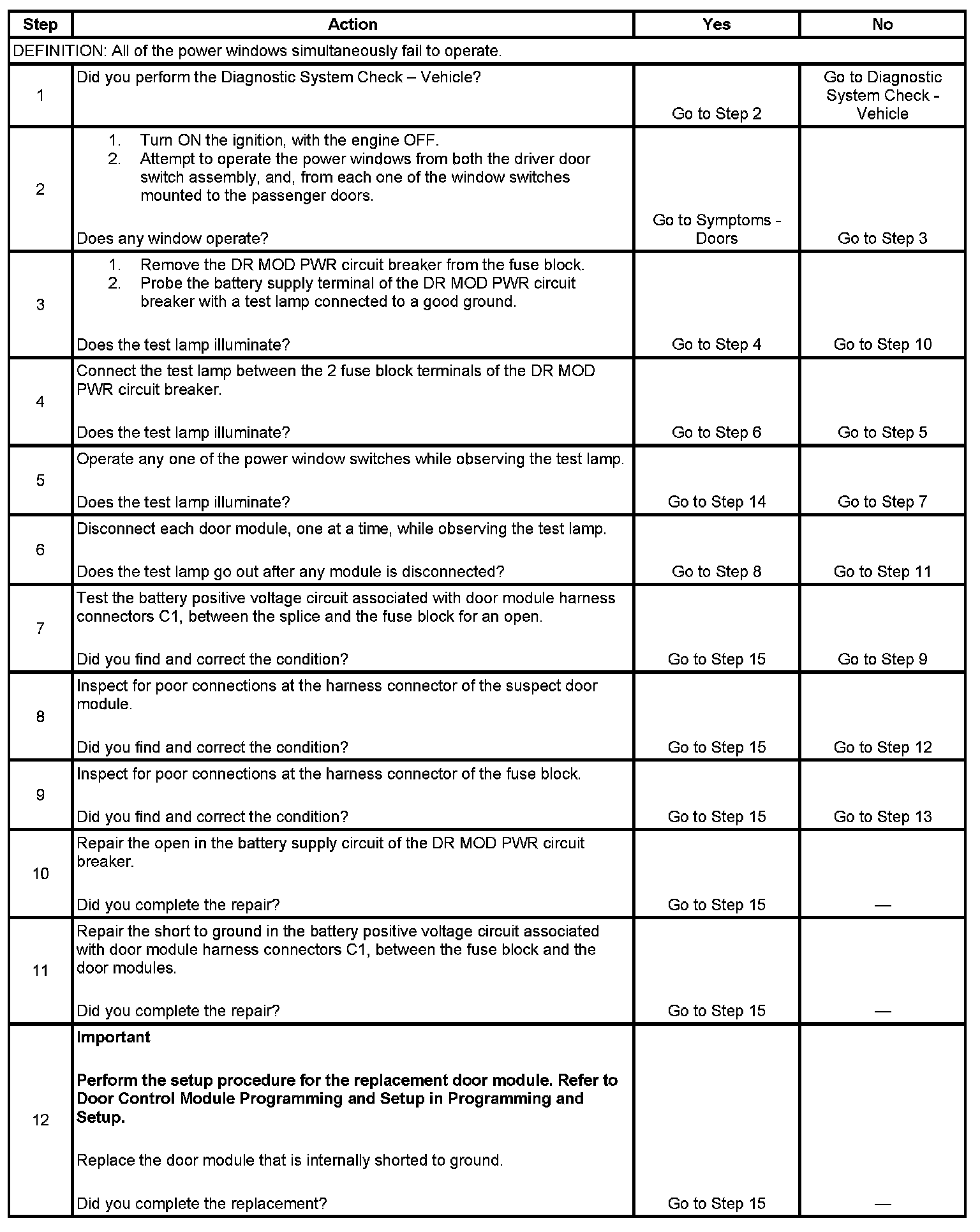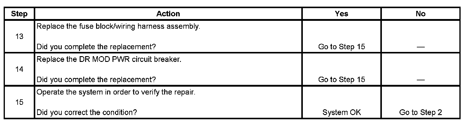 6. This step determines if a door module is internally shorted to ground, or the battery positive voltage circuit associated with door module harness connectors C1 is shorted to ground.