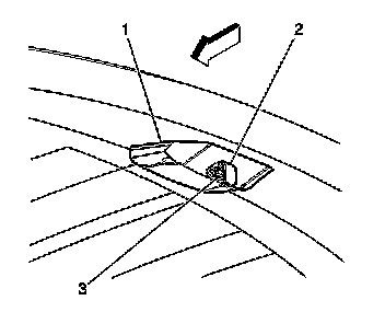 24. Using J 38778 disconnect the yellow plastic retainer (1) securing the headliner to the roof panel above the overhead console.