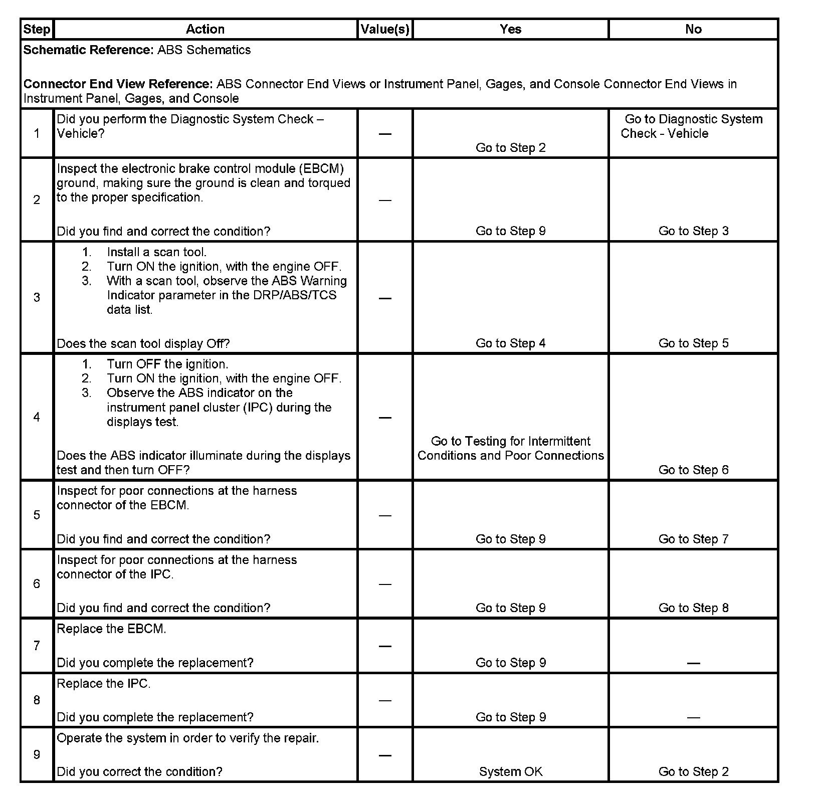 The instrument cluster controls the operation of the ABS indicator. The electronic brake control module (EBCM) reports the desired status of the ABS indicator via serial data messages. The ABS indicator signal circuit is a back-up reporting circuit to the serial data messages. The EBCM supplies ground through the circuit when the ABS is operating properly. When there is a problem with ABS that should turn on the ABS indicator, the EBCM opens the ABS indicator signal circuit. If there is a problem with the ABS serial data messages, the instrument cluster uses the ABS indicator signal to determine if the ABS indicator should be illuminated. Using the serial data messages and back-up circuit, the instrument cluster decides whether to turn on the ABS indicator.