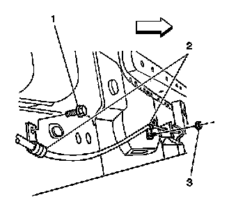6. Remove the intermediate park brake cable from the floor pan bracket (3).
