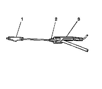 5. Use the J 37043 in order to depress the locking retainer (2) of the intermediate park brake cable housing (1).