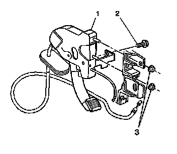 19. Remove the park brake pedal assembly (1) attaching nuts (3).