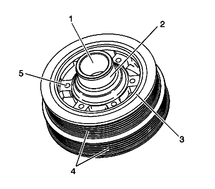 * Worn, grooved or damaged hub seal surface (2) - A crankshaft balancer hub seal surface with excessive scoring, grooves, rust or other damage must be replaced.