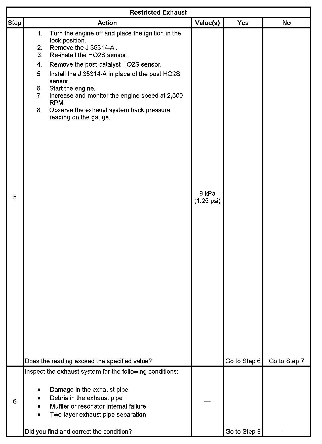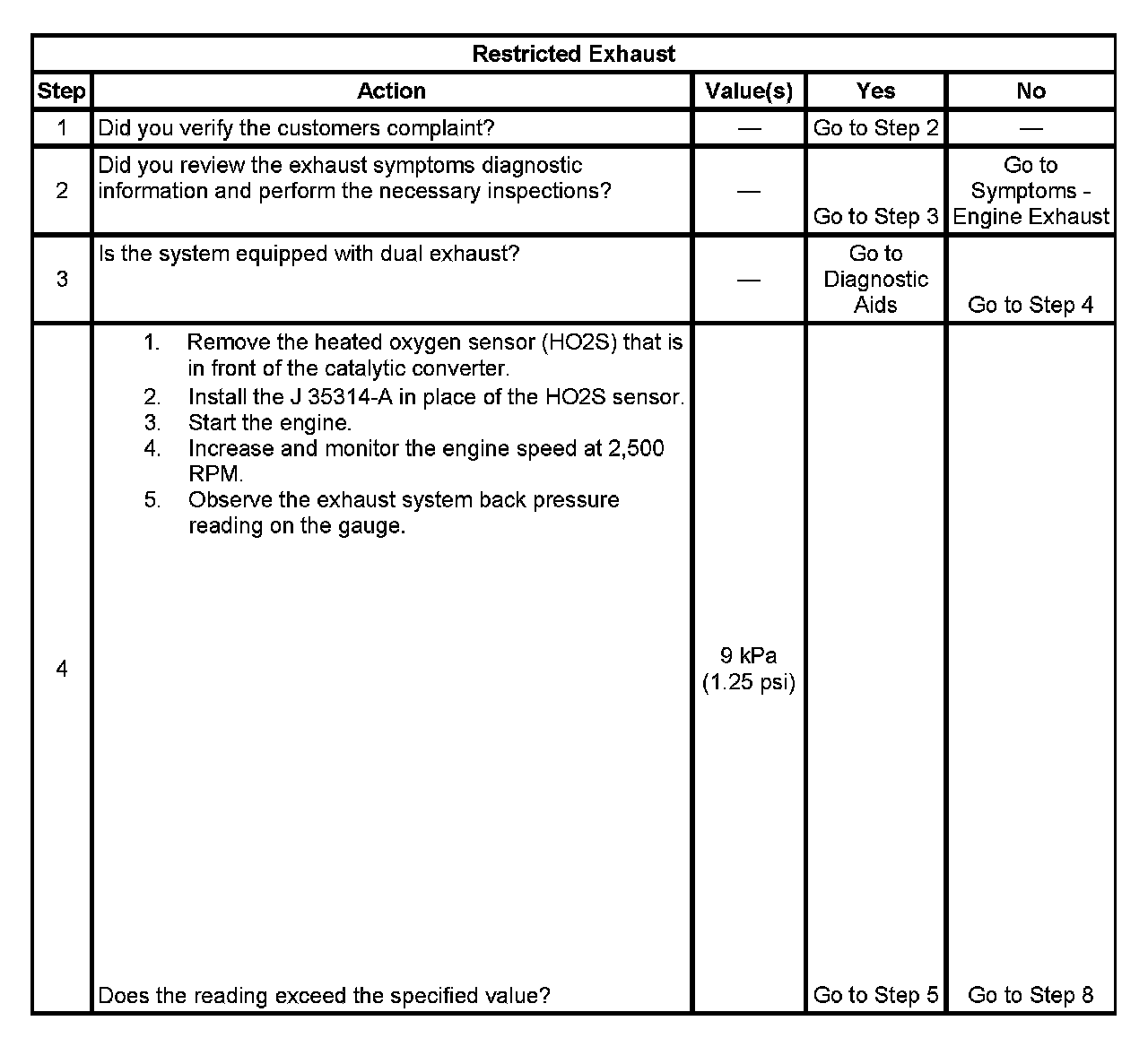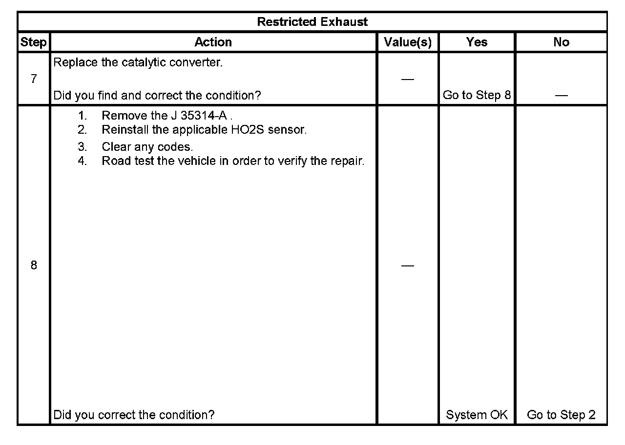 4. The exhaust system has very low back pressure under normal conditions. If the exhaust system is restricted, a significant increase in the exhaust pressure is noticed on the J 35314-A.Removing the HO2S sensor may set a DTC. When finishing this diagnostic table, be sure to clear all codes.