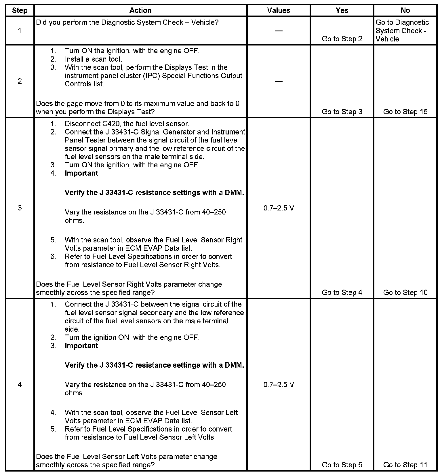 3. This step tests for a high resistance in the primary fuel level sensor signal circuit and the low reference circuit of the fuel level sensors.