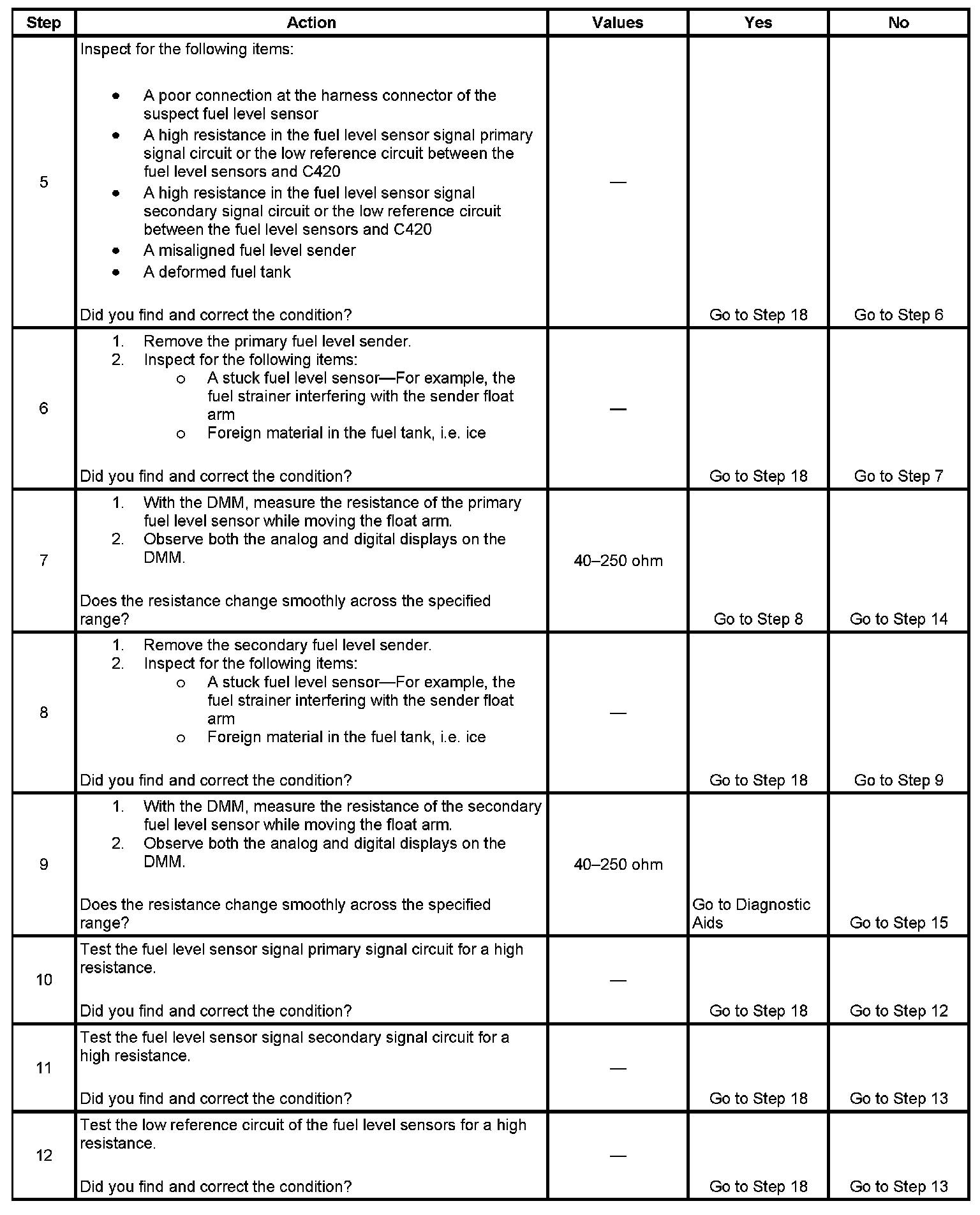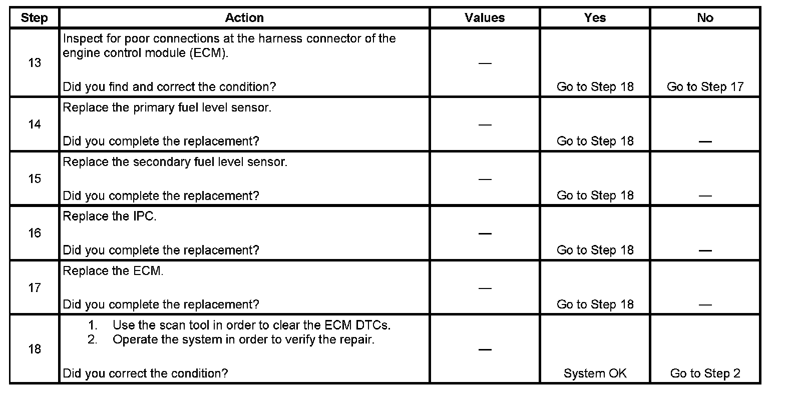 4. This step tests for a high resistance in the secondary fuel level signal circuit and the low reference circuit of the fuel level sensors.