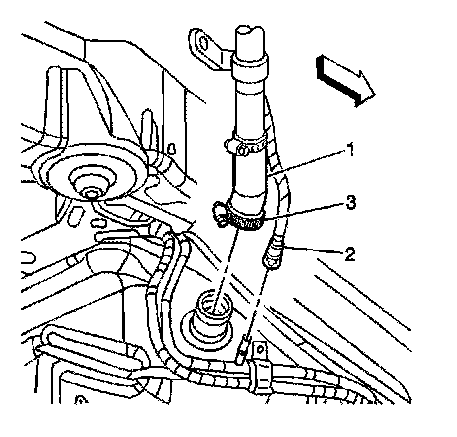7. Connect the filler hose (1) to the fuel tank. Tighten the fuel filler tube hose clamp (3) to 3.5 Nm (31 lb in).