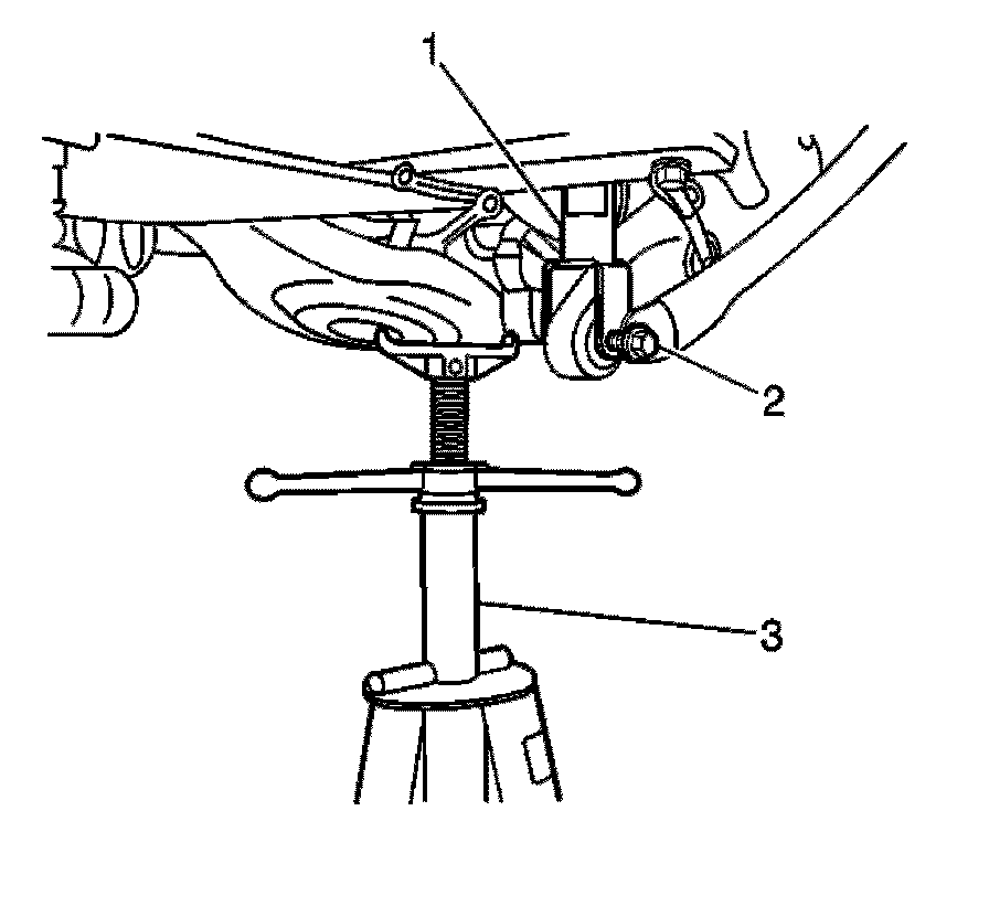 12. Raise the lower control arms using a suitable screw jack (3) in order to remove the load from the lower shock bolts (2).