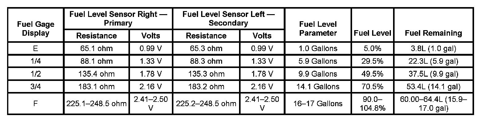 The information in this table is intended for use with the J 33431-C Signal Generator and Instrument Panel Tester. The fuel level sensor values represent the test values to be used on the Signal Generator to drive the fuel gage display to the indicated positions. Vehicles that require more than one fuel level sensor calculate gage position from many possible resistance combinations of fuel levels between the two tanks. Therefore, the values in the table may not correlate directly to readings taken from the vehicle primary or secondary sending units.