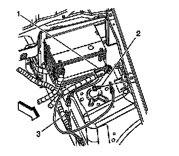 2. Remove the bolt (2) securing the battery negative cable to the side rail.