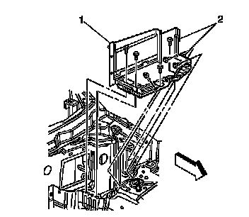 1. Position the battery tray (1) to the vehicle, locating the alignment datums (2) with the holes in the inner fender.