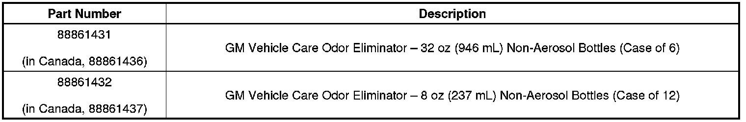 The GM Vehicle Care Odor Eliminator product is an effective odor elimination product when used properly. It must come into direct contact with the odor source. It should be used in conjunction with diagnostic procedures to first eliminate the root cause of the odor. Some procedures for use after odor root cause correction are: