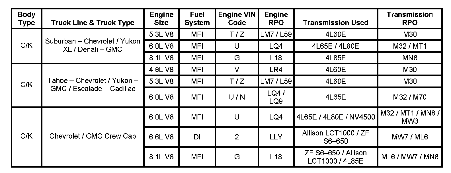 Engine and Transmission Usage (C/K Chassis and Utility Applications)