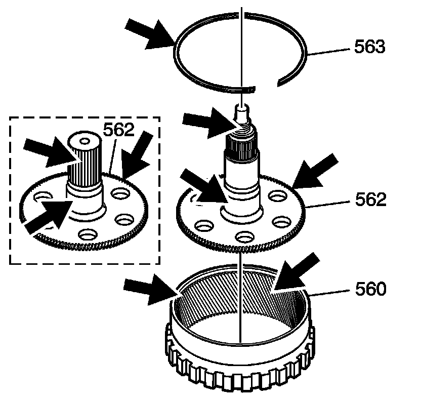 3. Install the snap ring (563) onto the rear internal ring gear (560). Be sure it is seated in the groove.