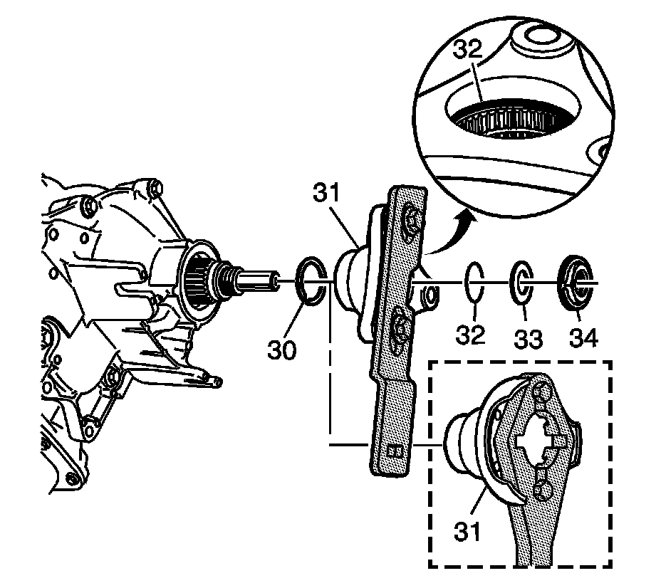 Install the NEW prop shaft flange thrust washer (33) and NEW prop shaft flange nut (34) using GM P/N 89021297.