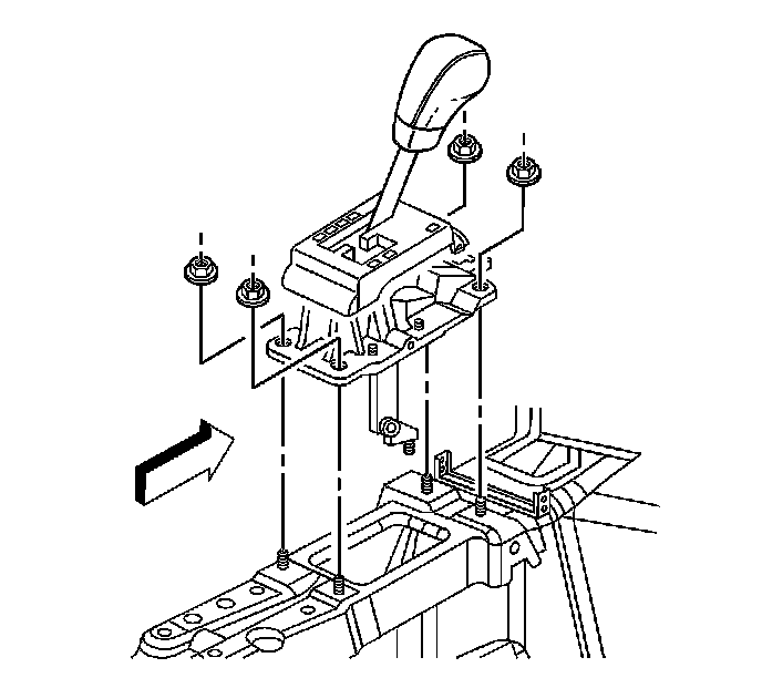 9. Remove the 4 nuts securing the shift control assembly to the tunnel reinforcement.