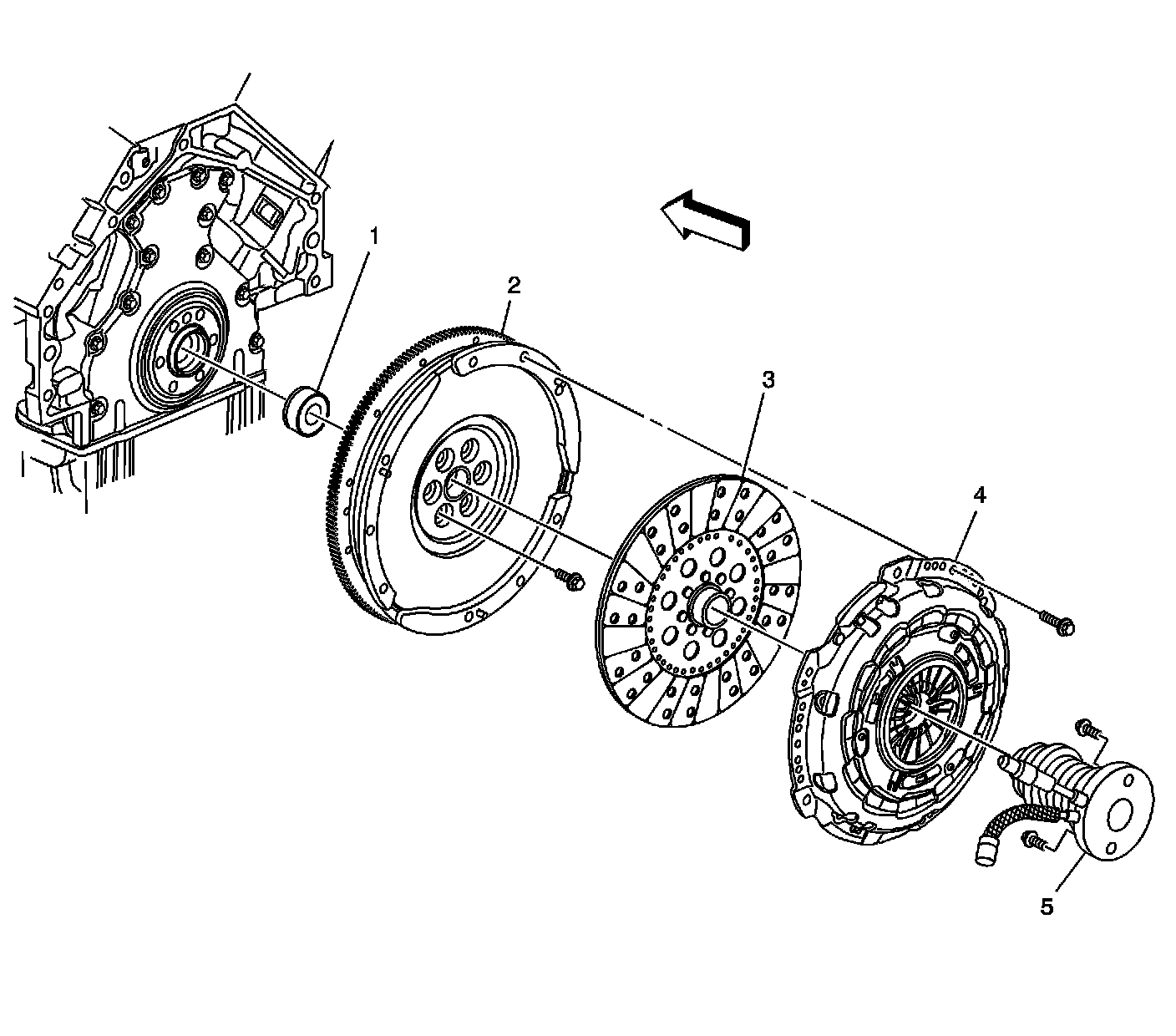 The clutch release bearing is moved by the actuator assembly to move the release levers which move the pressure plate to the rear, thus separating the clutch disc from the flywheel when the clutch pedal is depressed by the driver. A piston return spring in the actuator cylinder preloads the clutch linkage and assures a small load on the release bearing with the actuator assembly at all times. As the clutch disc wears, the diaphragm spring fingers move forward forcing the release bearing, actuator assembly, and pushrod to move. This movement forces the actuator cylinder piston to move forward in its bore, consuming hydraulic fluid from the master cylinder reservoir, thereby providing the SELF-ADJUSTING feature of the hydraulic clutch linkage system.