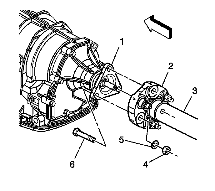 3. Remove the propeller shaft coupler-to-transmission flange bolts (6), nuts (4) and washers (5).