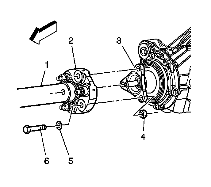 4. Remove the propeller shaft coupler-to-differential flange bolts (6), nuts (4) and washers (5).
