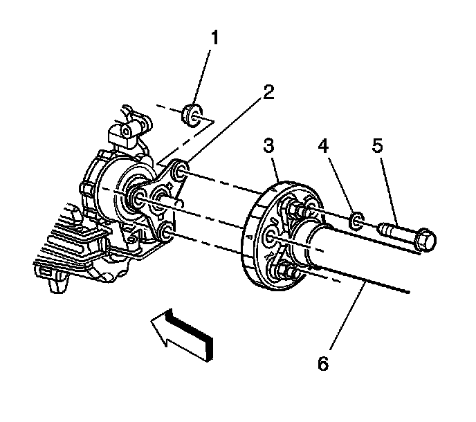 8. Install the propeller shaft coupler-to-differential flange washers (4) to the propeller shaft coupler-to-transmission flange bolts (1).