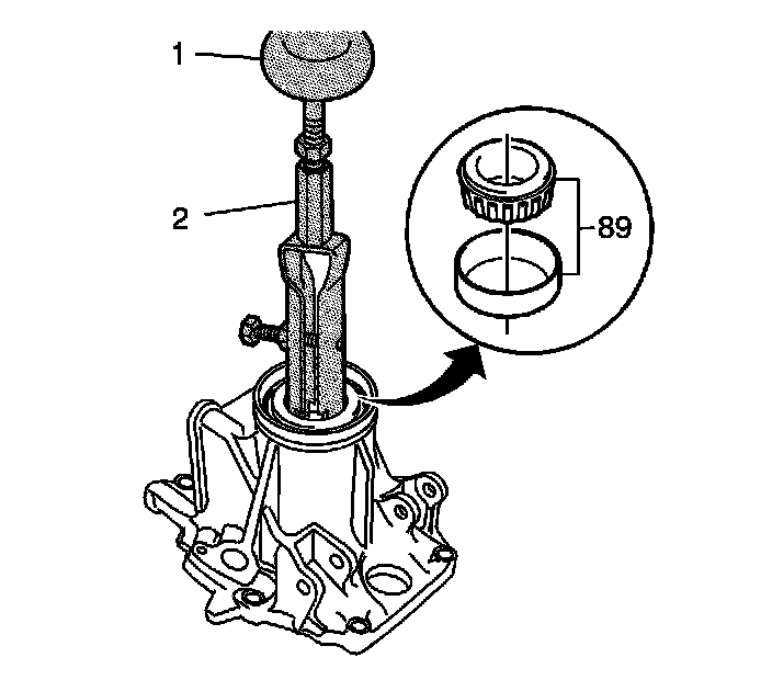 2. Using J 2619-01 (1) and J 26941 (2), remove the rear output shaft bearing assembly (89).