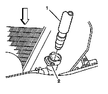 2. Depress the tab (2) on the headlamp washer hose connection, in order to disconnect the headlamp washer hose (1).
