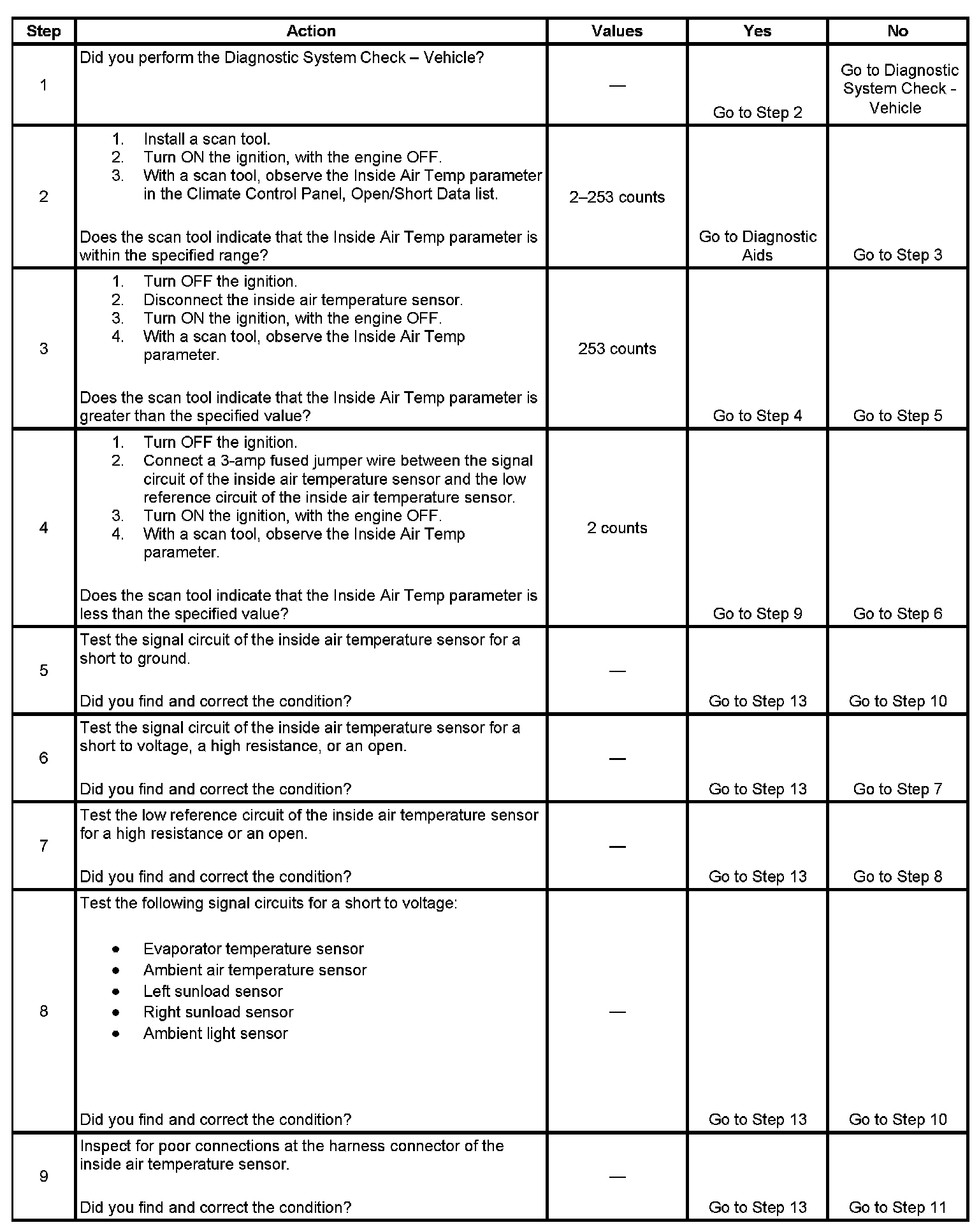 The HVAC control module detects the inside air temperature sensor signal circuit is less than 2 counts or greater than 253 counts for 30 seconds.