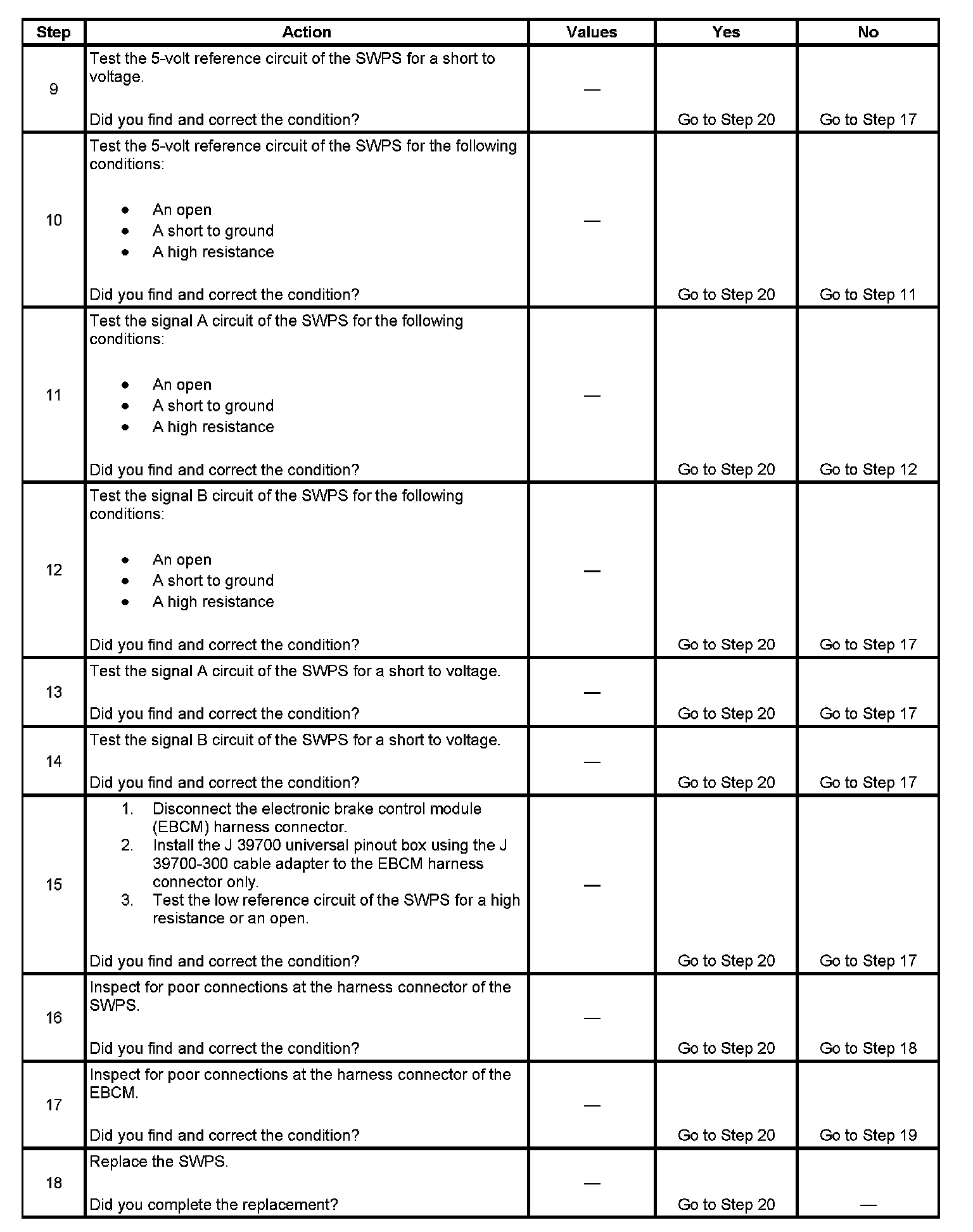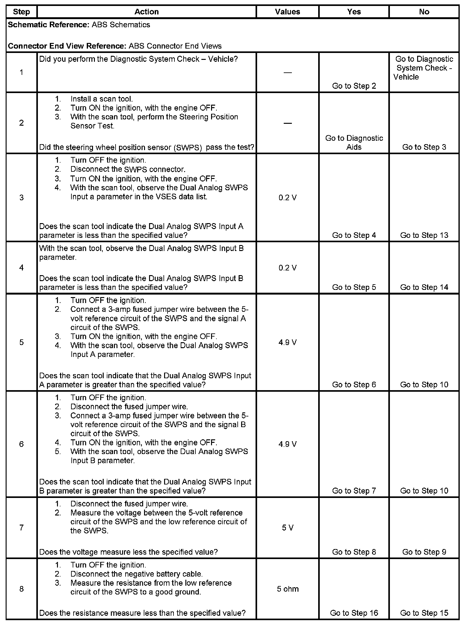 3. This step tests for the proper operation of the steering wheel position signal A circuit in the low voltage range.