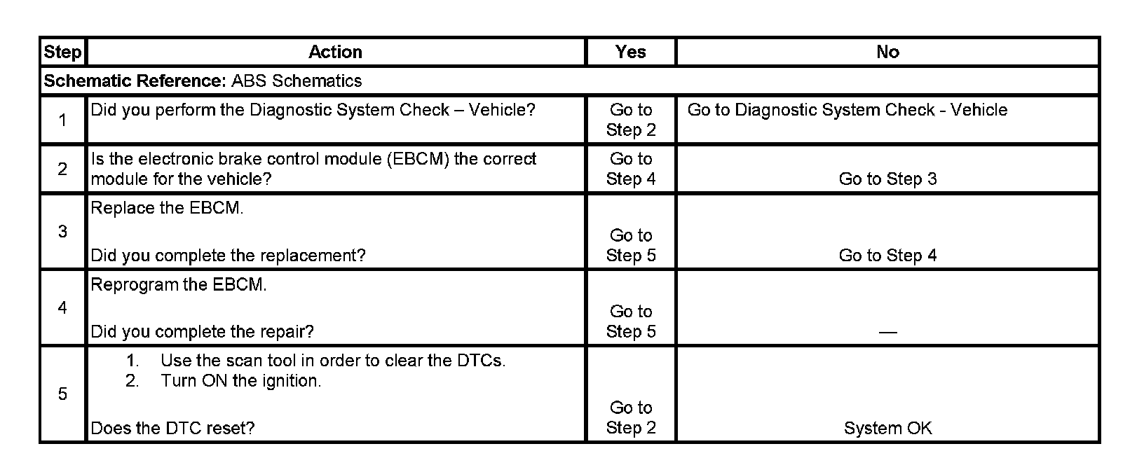 If the DTC was set after EBCM replacement, verify that the replacement EBCM and software are correct for the vehicle.