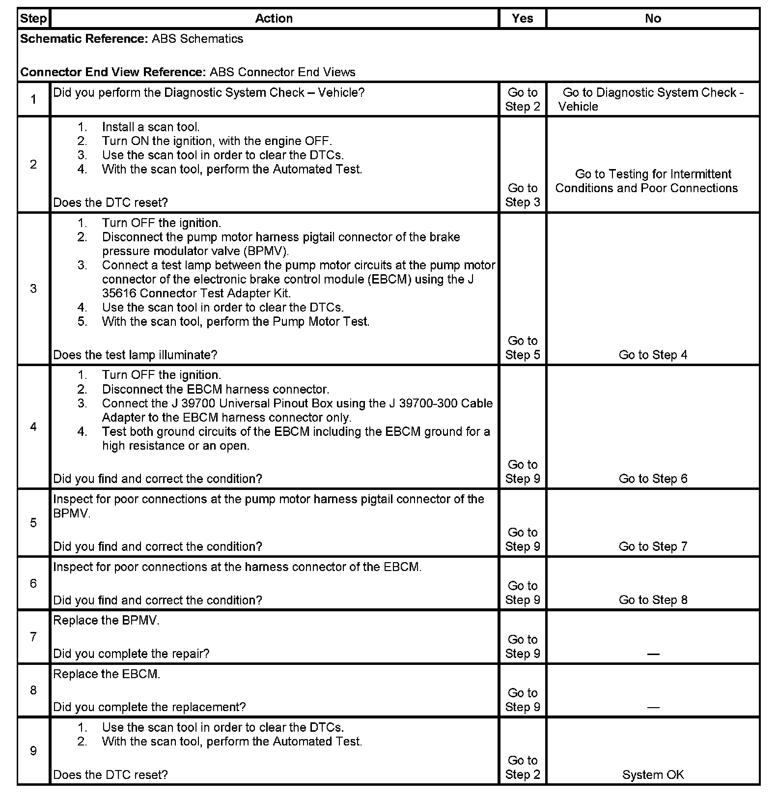 3. This step tests the ability of the EBCM to control the pump motor. If the test lamp illuminates, the pump motor circuit within the EBCM is good.