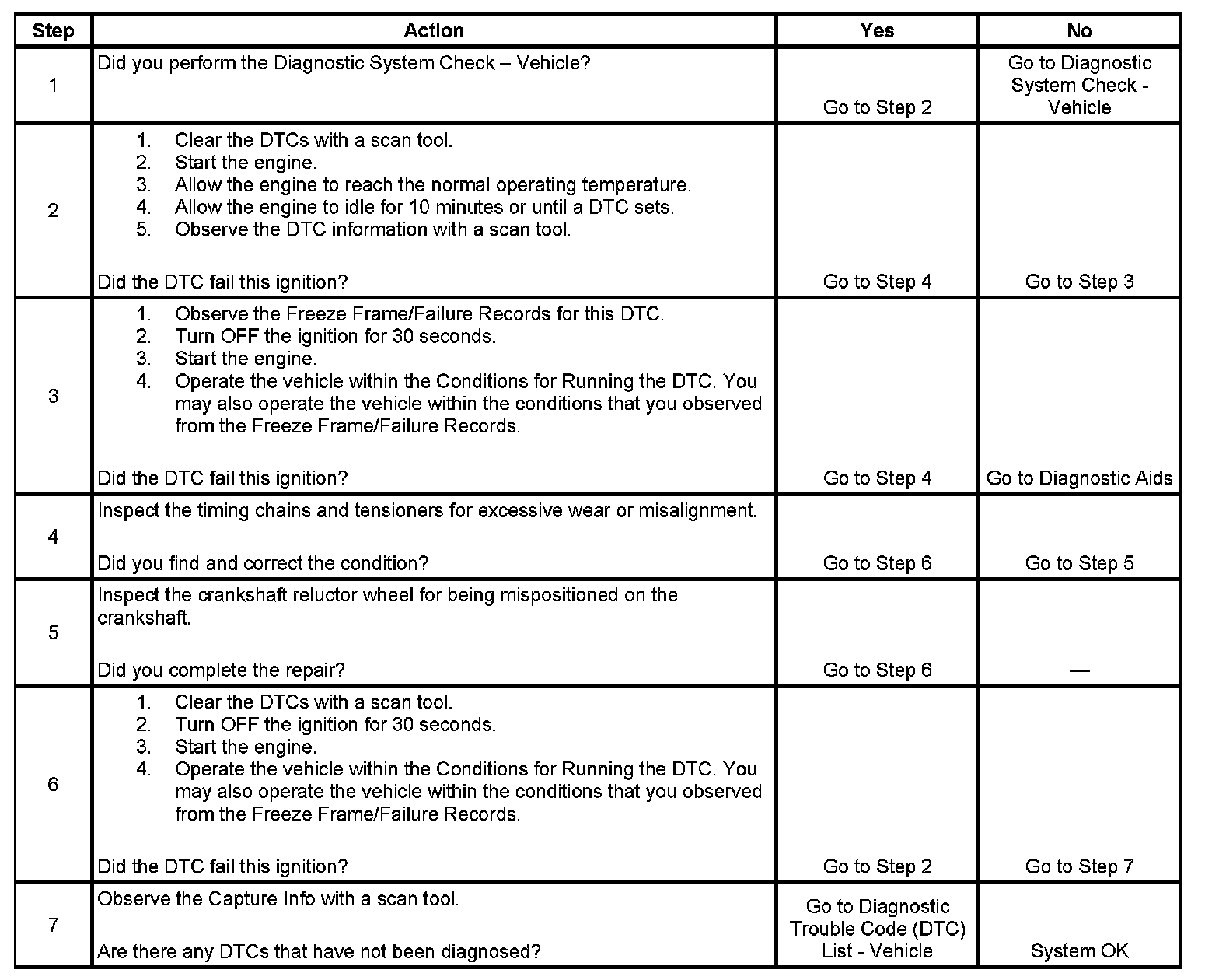 The engine control module (ECM) tests for a misalignment between both camshafts on one bank of the engine and the crankshaft. The misalignment would be at an idler sprocket for bank 1 or at the crankshaft. Once the ECM learns the position of both camshafts on one bank of the engine, the ECM compares the learned values to a reference value. If the ECM detects both learned values for one bank of the engine is exceeding a calibrated threshold in the same direction, this DTC sets.