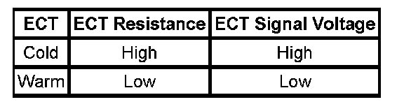 The engine coolant temperature (ECT) sensor is a variable resistor that measures the temperature of the engine coolant. The engine control module (ECM) supplies 5 volts to the ECT signal circuit and supplies a ground to the low reference circuit. If the ECM detects a low ECT signal voltage, which is a high temperature indication, this DTC sets.