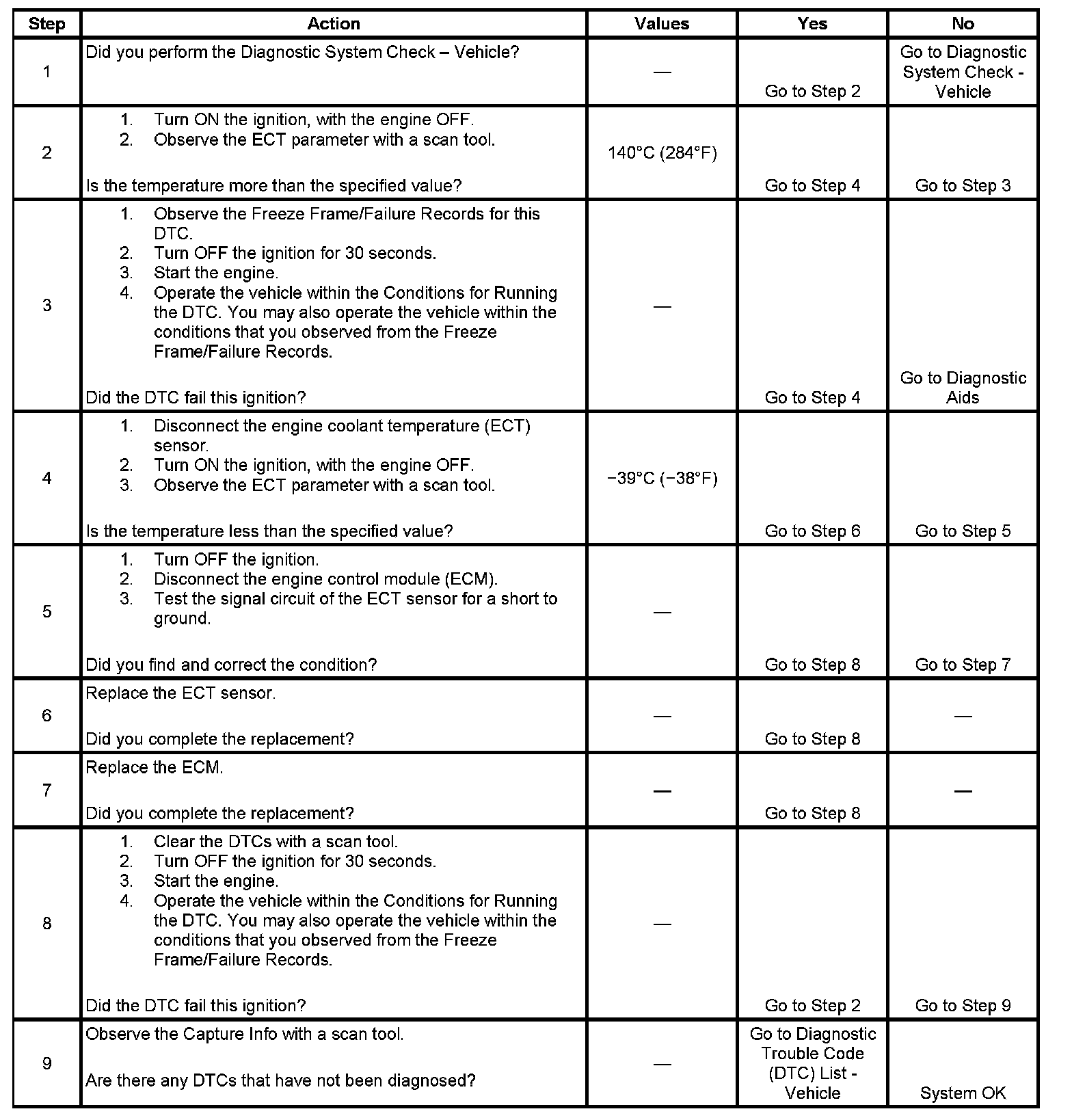 2. This step determines that a condition exists. If the temperature is more than the specified value, test for a condition in the circuits of the ECT sensor.