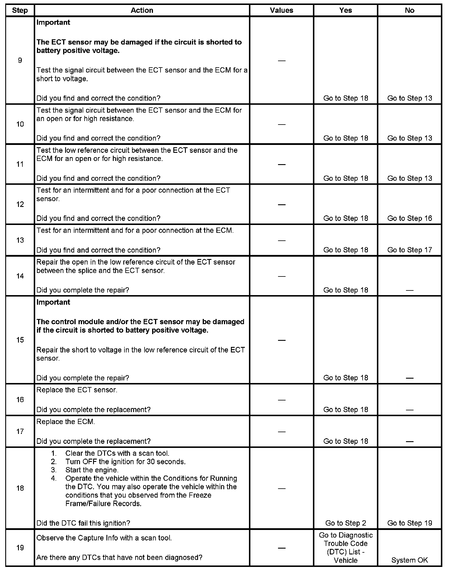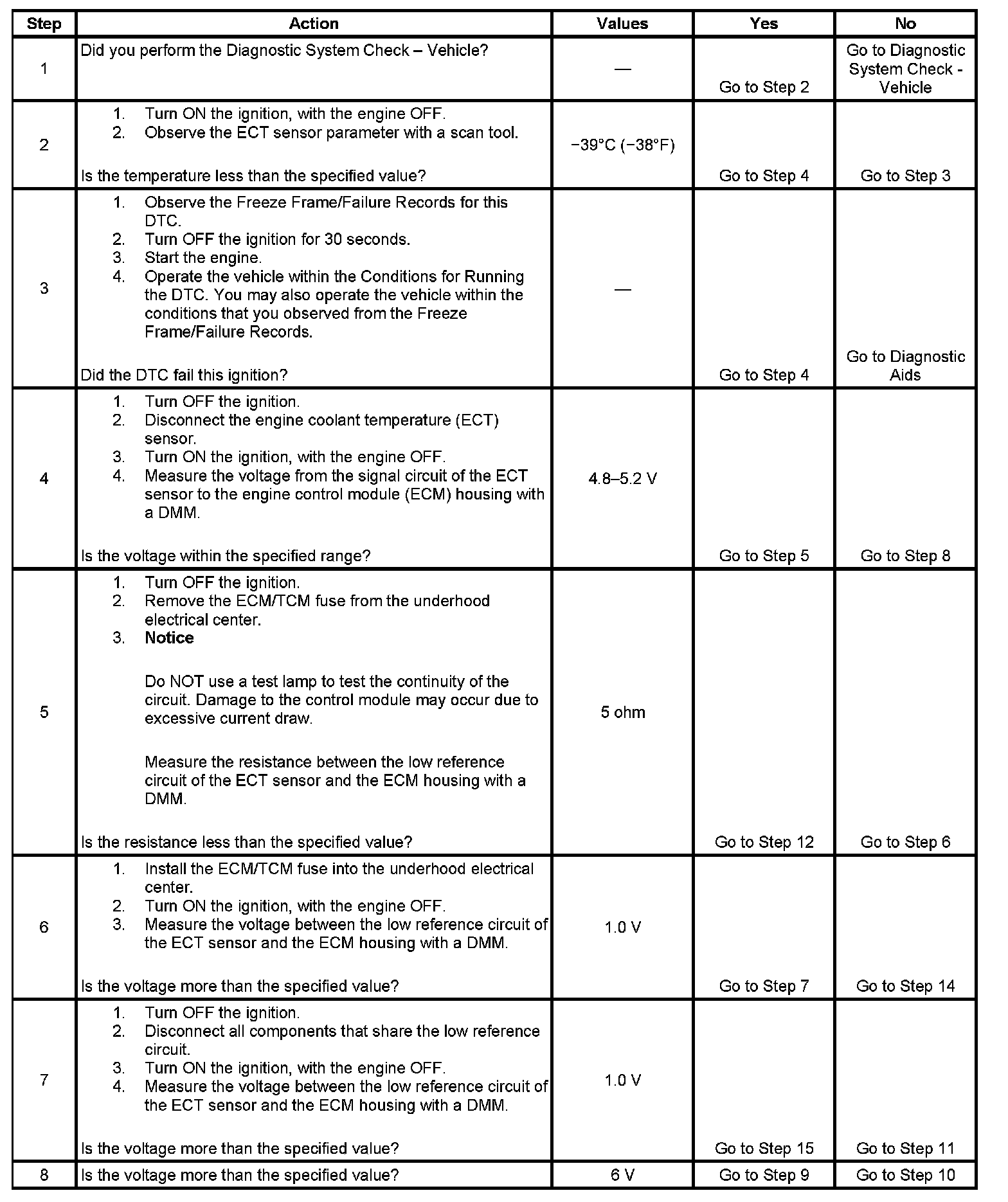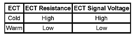 The engine coolant temperature (ECT) sensor is a variable resistor that measures the temperature of the engine coolant. The engine control module (ECM) supplies 5 volts to the ECT signal circuit and supplies a ground to the low reference circuit. If the ECM detects a high ECT signal voltage, which is a low temperature indication, this DTC sets.