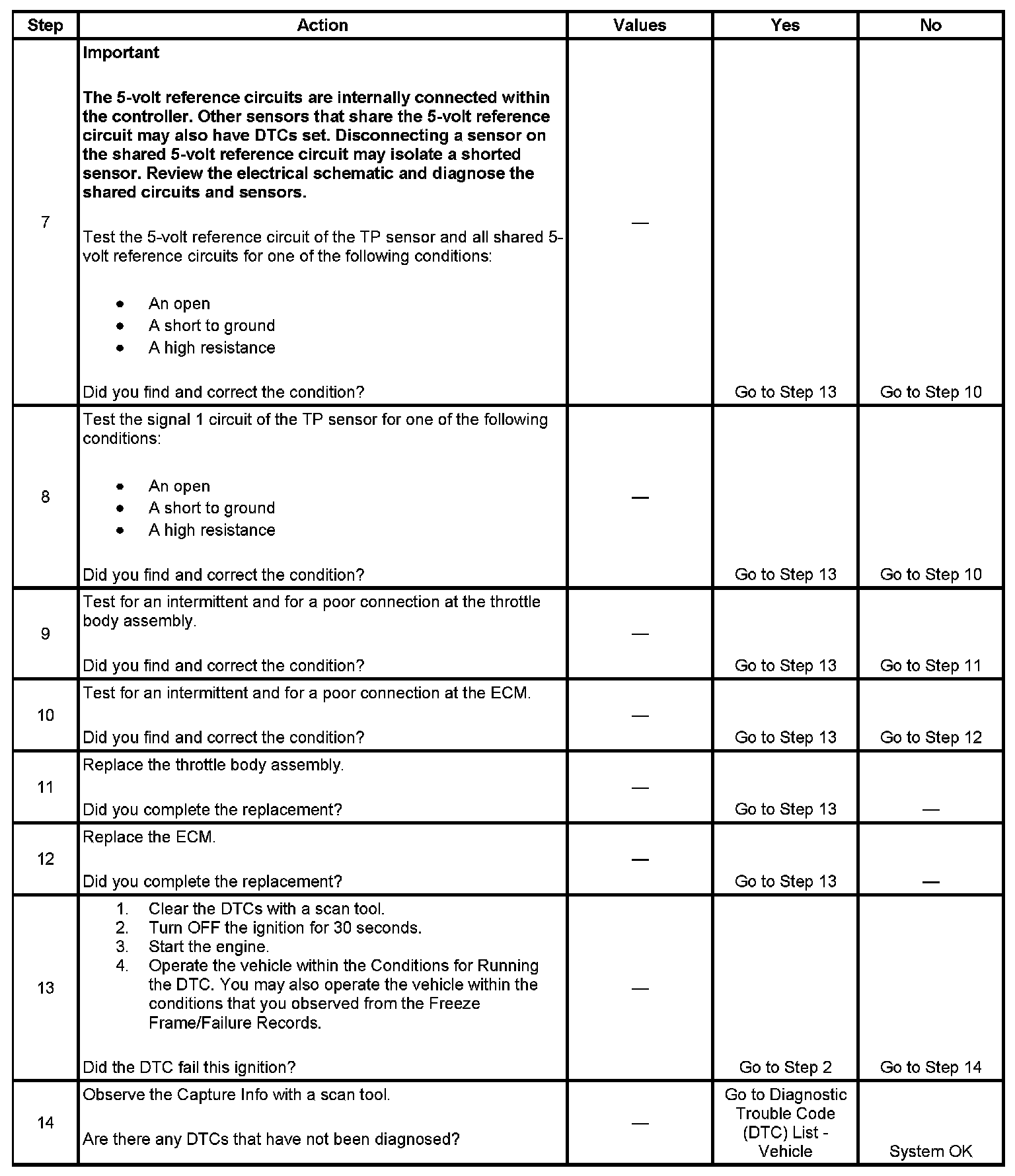 6. This step tests the signal 1 circuit of the TP sensor. If the TP sensor 1 voltage parameter is not 4.8-5.2 volts, test for a condition in the signal 1 circuit.